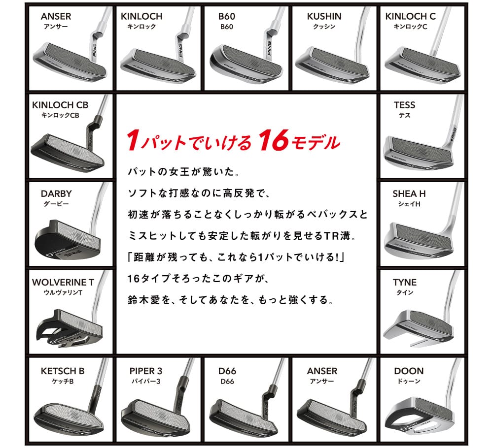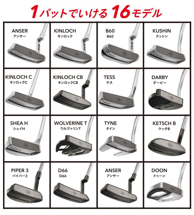 | モデル名 | 素材 | ヘッド重量(g) | 調整可能ライ角(度) | 本体価格(税抜) | <標準ライ角> 70度 <標準ロフト角> 3度 <標準シャフト長> 34inch カウンターバランス 「DOON」 「KINLOCH CB」 36inch |
