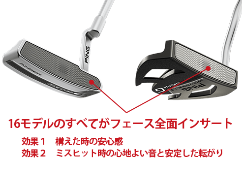 ヘッドは2ピース構造のため、最大限インサート部分を大きくすることが可能になりました。このフェース全面インサートは構えた時の安心感をもたらすとともに、重量周辺配分効果によりスイートエリアを最大限拡大。ミスヒット時でも心地よい音 が奏でられ、安定した転がりを生み出します。TR溝との相乗効果で、他のインサートパターでは実現できていない初速を安定させるテクノロジーがあります。18モデルのずべてがフェース全面インサートです。