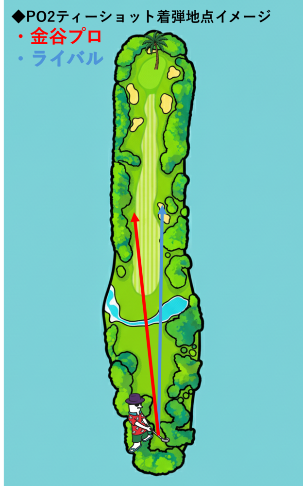 PO1ホール目はライバルがティーショットを刻む中、金谷選手はドライバーでフェアウェイをキープし共にパー。両者の差は生まれなかった。