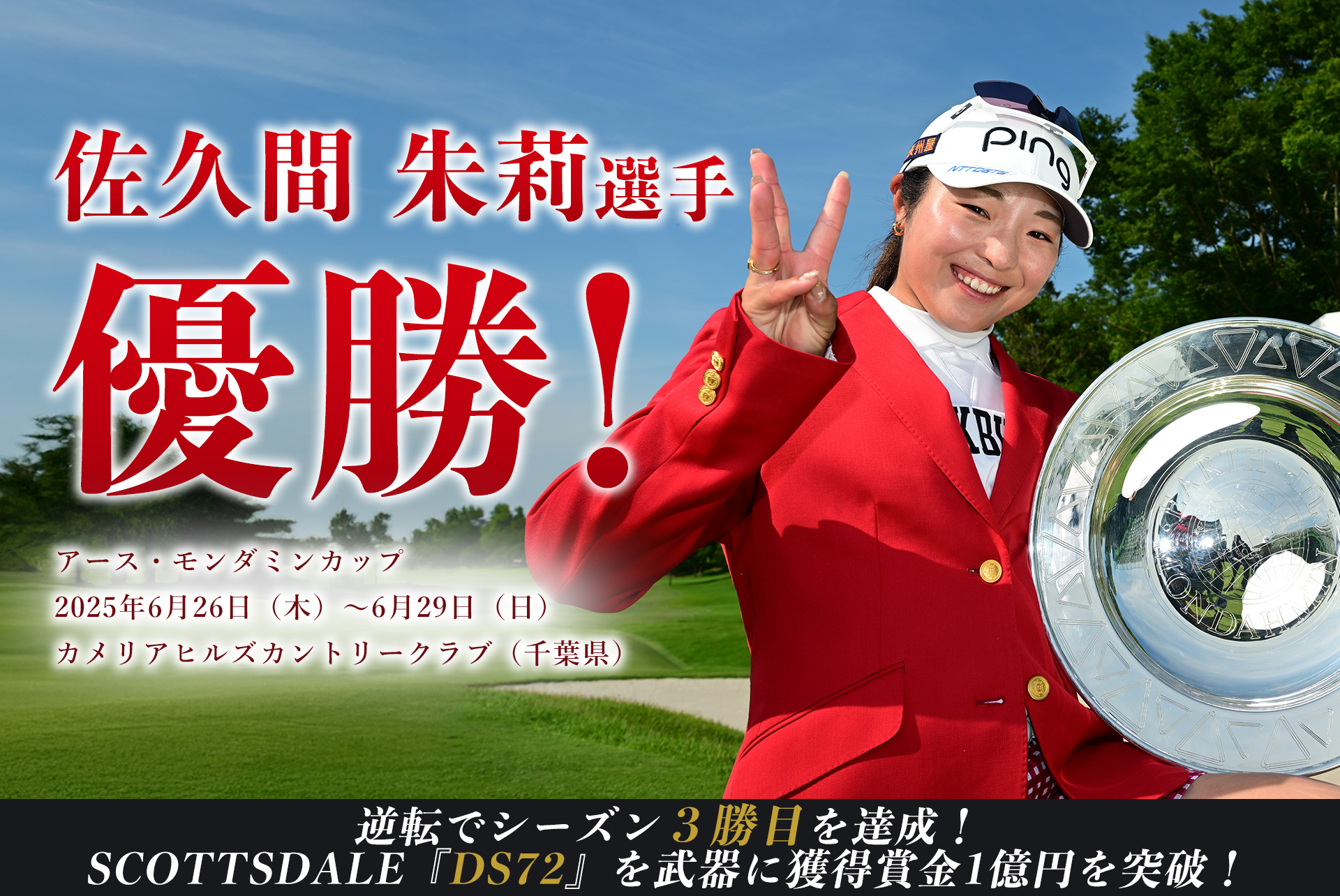 初の年間女王獲得へ、勢いが止まりません。JLPGAツアー15戦「アース・モンダミンカップ」の最終日、首位と1打差の2位タイからスタートしたPING契約の佐久間朱莉選手は4バーディ・2ボギーの“70”をマーク。ボギーが先行し、一時は首位の選手に3打のリードを許す苦しい展開となりましたが、後半に着実にスコアを伸ばして接戦を制し、逆転で今季3勝目を挙げました。