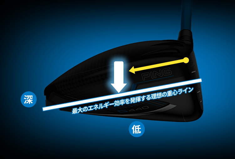 「G440シリーズ」の重心は歴代のGシリーズで最も飛び重心に近くなっていましたが、「G440 K」はさらに重心が約2%深く、約1.5%低く※なったことで、理想的な飛び重心に近づいています。つまり、PINGのドライバー史上最もエネルギー伝達効率の良いドライバーになっているのです。