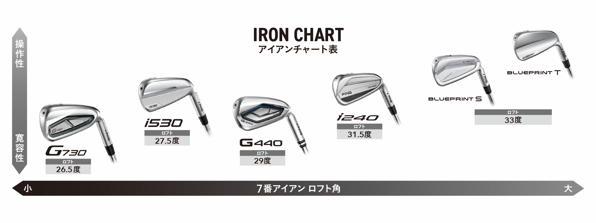 山崎 『G440』の7番アイアンが29度で、『ブループリントS』の7番アイアンが33度なので、『i240』の31.5度は真ん中に位置します。ただし、もちろんロフト角の調整は可能です。前作の『i230』は7番アイアンが33度でしたが、『i240』でも同じロフト角に調整可能です。ピンではアイアンを出荷するときに全てのクラブのロフト角とライ角を1本1本調整してから出荷しています、その際に指定のロフト角に調整するだけですので、上記の表の中であれば調整が可能です。ゴルファーのパフォーマンスを最大化するために、ロフトの指定が可能です。日本市場では、今回の『i240』はど真ん中のスペックになるよう、”パワースペック”という少し距離が出るようなロフトセッティングを標準採用しております。