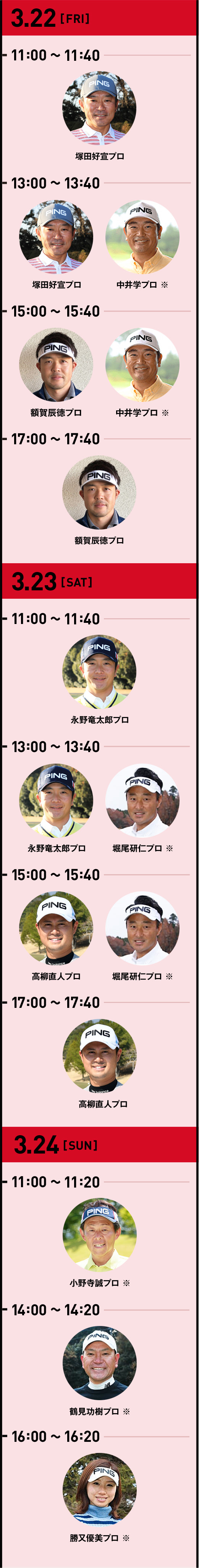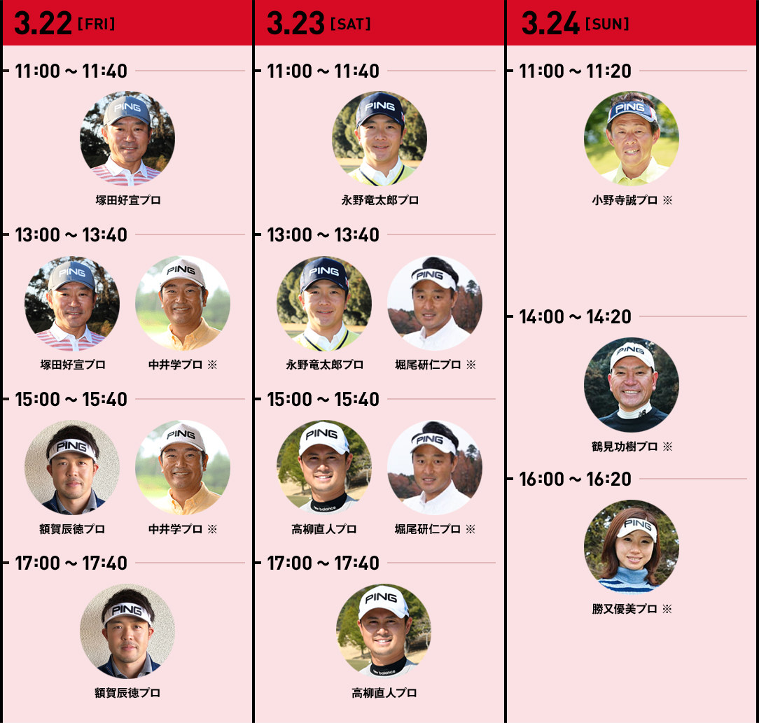 「CLUB PING」打席では、事前予約に加えて、最終日のみプロのワンポイントレッスン付きの特典あり!なんと試打後に鶴見功樹プロ、小野寺誠プロ、勝又優美プロのレッスンが受けられます。