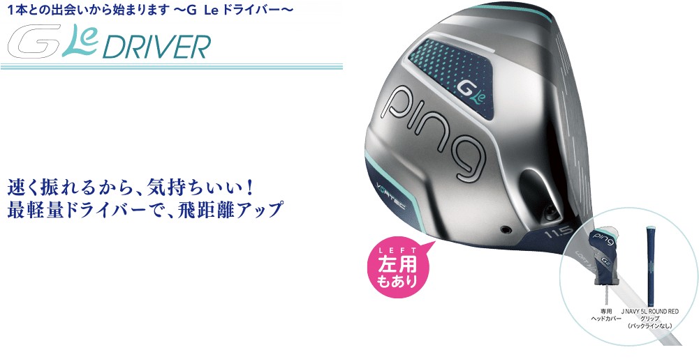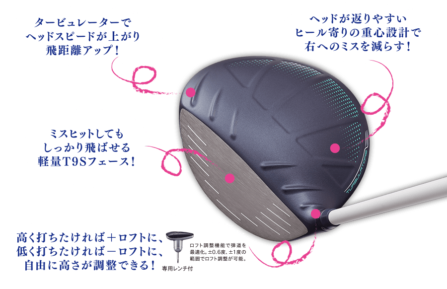 日本市場向けに、ヘッド/シャフト/グリップのすべてを最適化した最軽量・女性向けドライバー。ヘッドには空気抵抗を軽減するタービュレーターに加えて、フェース周辺部分が約16%薄いT9Sを初採用。より速く振ることが可能となり、ミスヒットしても大きな飛距離を生み出します。フェースをスクエアに戻しやすいヒール寄り重心により、右へのミスも軽減します。(前作比/当社調べ)