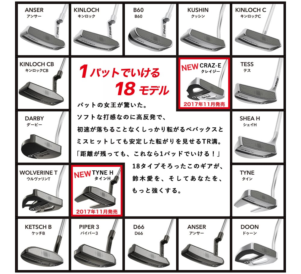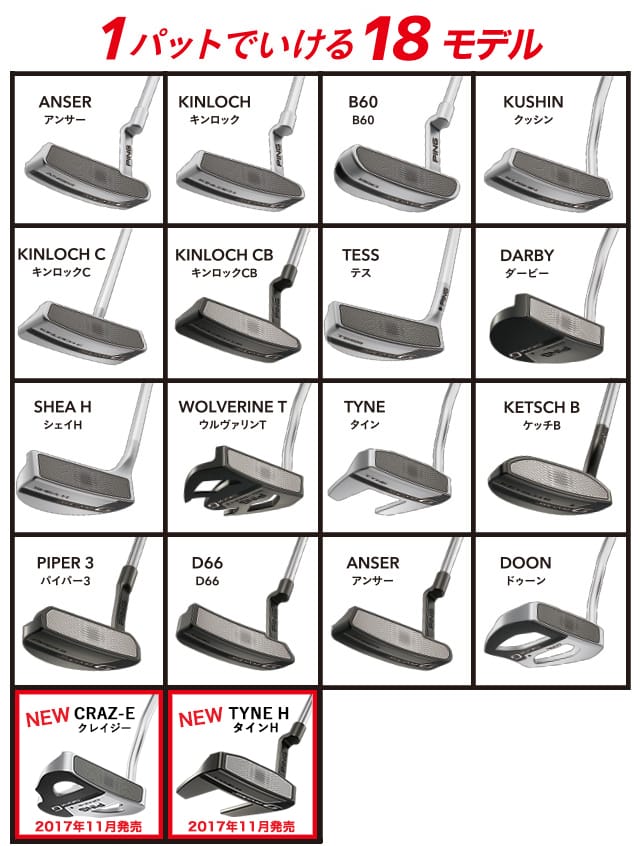 | モデル名 | 素材 | ヘッド重量(g) | 調整可能ライ角(度) | 本体価格(税抜) | <標準ライ角> 70度 <標準ロフト角> 3度 <標準シャフト長> 34inch カウンターバランス 「DOON」 「KINLOCH CB」 36inch |