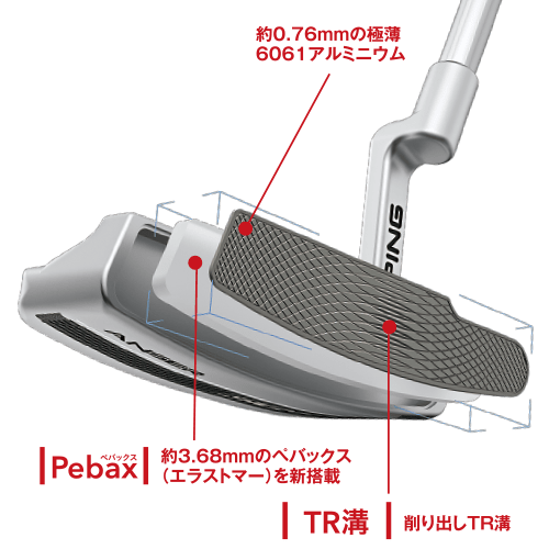 約0.76㎜の極薄アルミニウムの削り出しTR溝に、約3.68㎜のペバックス(エラストマー)を複合で搭載。ペバックスによりインパクト時に発生するボールとの衝突を和らげる効果があり、余分な振動を抑えるのと同時に反発力が高まりました。その結果、ソフトな打感でも初速が落ちることなく転がり、心地良い打感としっかりとしたインパクト音を実現しました。
