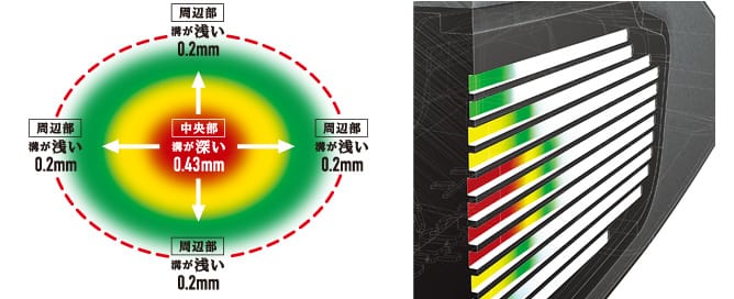 センターヒットをゼロとした場合、TR溝はオフセンターヒットした場合のボール初速(距離)の変化が少なくなります。これは打点位置が一定しないほとんどのアマチュアゴルフアーにとって、距離感を合わせやすい結果となります。”