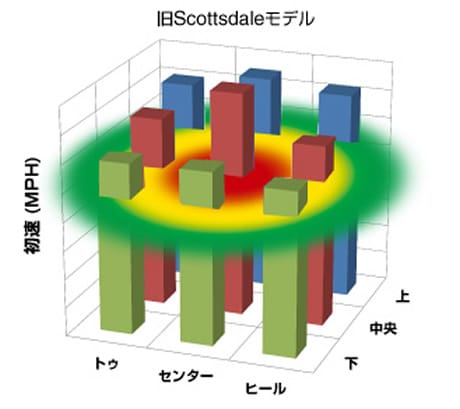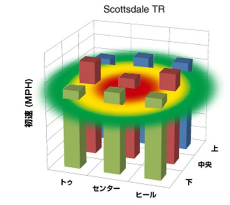 Scottsdale TRの初速を表したチャート図。右の旧モデルに比べフェースのどの位置にあたっても初速が安定していることがよくわかる。
