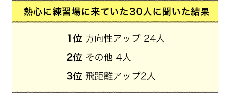 それこそ15年くらい前になるが、私は雑誌編集者時代、米国の練習場に行ってドライバーショットの悩み・望みについて飛び込みでアンケート取材したことがある。回答項目は①飛距離アップ ②方向性アップ ③その他 から1つだけ選ぶというシンプルなものだった。