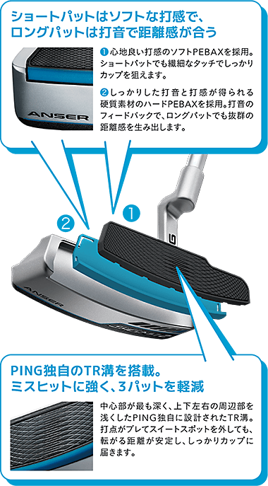 一方、ロングパットでは打感に加えて、"打音"が距離感を作り出す上で大切となります。インナーインサートに車と同様の硬さのハードPEBAXを採用したのはそのため。ハードPEBAXがしっかりとした打音を生み出し、ロングパットでも的確に距離がコントロールできるので、カップインの確率もアップするというわけです。